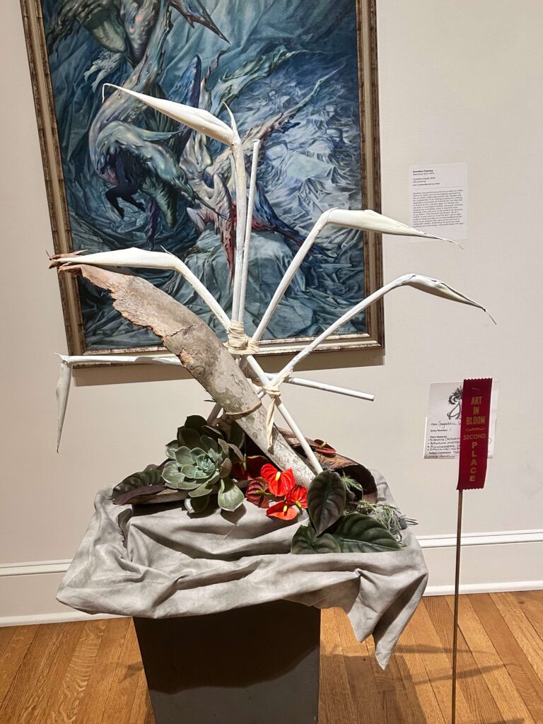 Most of the arrangements were on the second floor, in the permanent collection. This gives the florists (if that’s what they are called) a chance to study the work they are reacting to in blooms. I particularly liked the one in front of the Dorthea Tanning painting in the permanent collection. I can’t remember the picture’s title, nor am I going to look it up to confirm it’s Dorthea Tanning. Take my word for it.